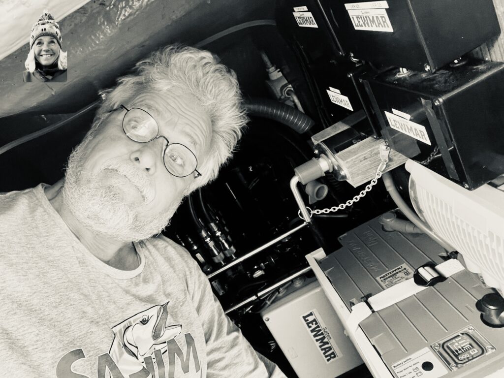 We’ve got here the hydraulic pump with the operation system, adjusted with double relay’s per button, powered by two lithium batteries connected in 24v. The hydraulic system is for handling the sails as well as two of the winches. The ventilating-system from the engine room is going through here, as well as the second waterlock for the exhaust. Then we have one of the two manually operated bilge pumps here and outgoing hoses for both the electrical pumps. There’s an inlet hose for the big (750 liter) fuel tank underneath which we don’t use anymore. The 350 liter tank on the starboard side is enough for us to travel at least 300 nautical miles under engine. Finally there’s enough space left for our little foldable bikes.